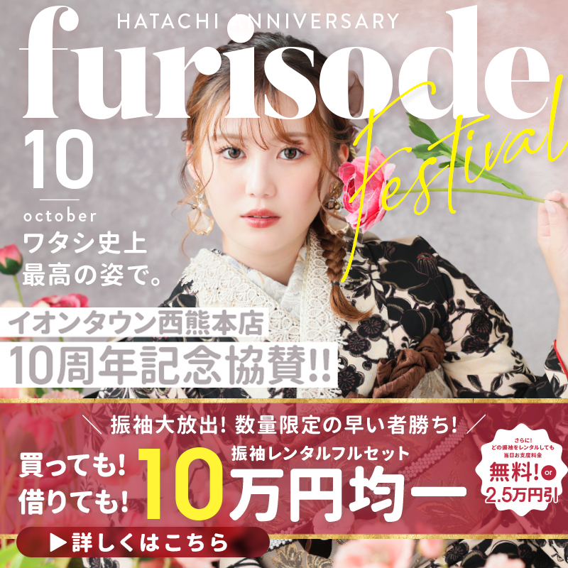 #成人式・振袖 ~2025年10月31日 【10月限定】店舗10周年協賛SALE開催♡【振袖レンタル】 イオンタウン西熊本店10周年記念として 記念協賛キャンペーン開催♥ 10月限定で振袖買っても借りても10万円均一!! 数量限定だから急いでおこしください♥ イマお得に運命の一枚と出会っちゃお! 【振袖特設サイトはこちらをタップ】 【新作カタログはこちらをタップ】 ▼振袖レンタル専門サイトは下の画像をタップ! 一覧に戻る