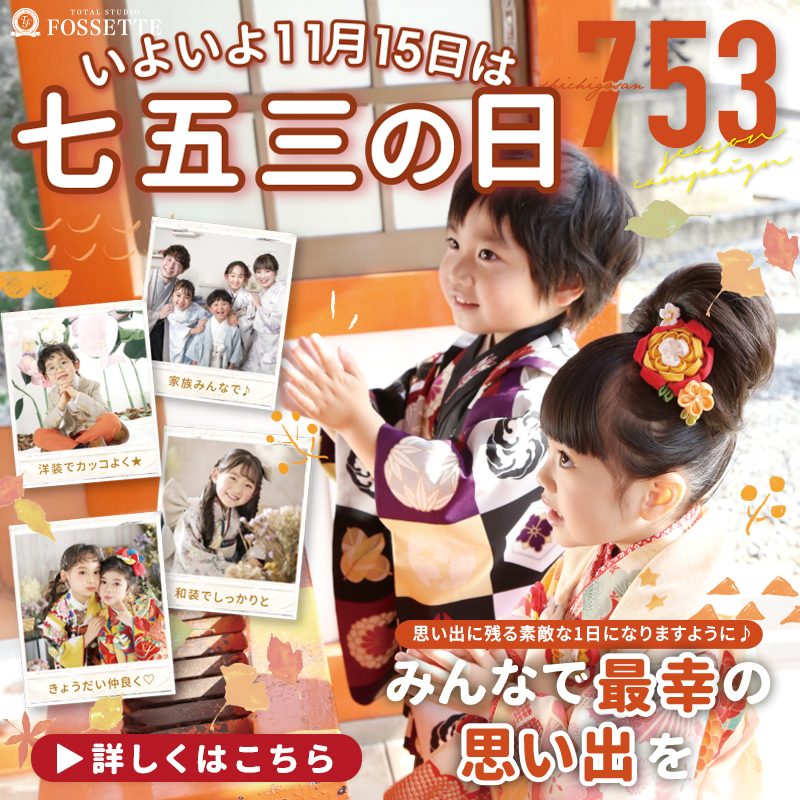 #七五三 ~2025年11月30日 【11月限定】いよいよ七五三本格シーズン!!【お得に撮るならフォセット♡】 いよいよ11月15日は七五三の日!! 大人気!お写真付きのおめでとうプラン 撮影当日にそのまま神社へお参りに行ける1DAYプランも登場♥ 七五三をお得に楽しめちゃうのはフォセットでしょ! ▼詳しいキャンペーン内容はこちら! 【タップして今すぐWEBチラシを見る】 一覧に戻る
